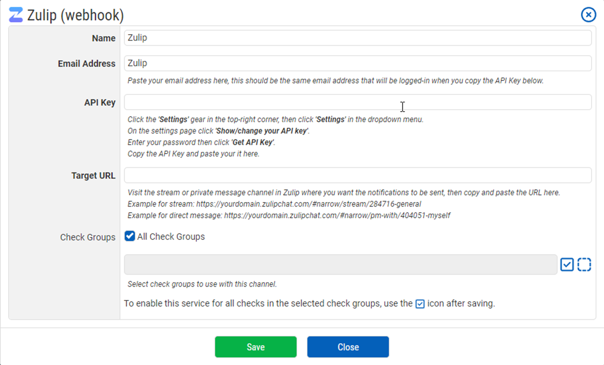 We're pleased to announce that we've added Zulip as a notification channel for your CheckCentral notifications! To get started with it, login to your CheckCentral dashboard, then click Notifications > Organization. From there you can add it as a new channel, and detailed instructions are in the configuration window.