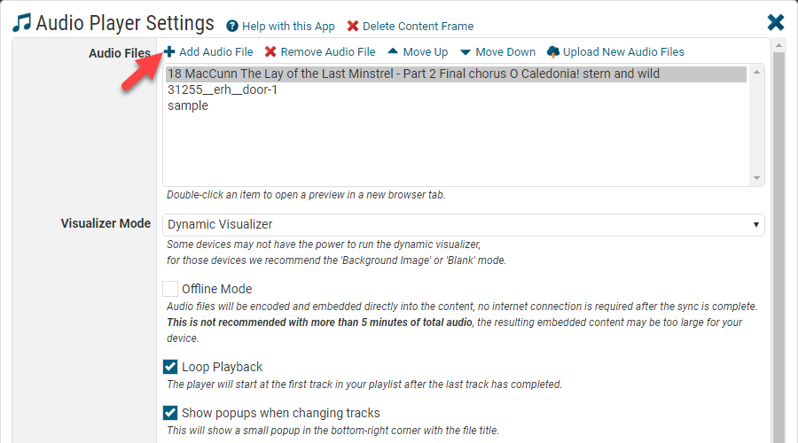 When you're finished configuring the list of audio files, click the green "Save" button, and you're all set! If the changes don't show up on your device immediately, click the "Reload Content Frames" link at the top of the device page to force a refresh.
