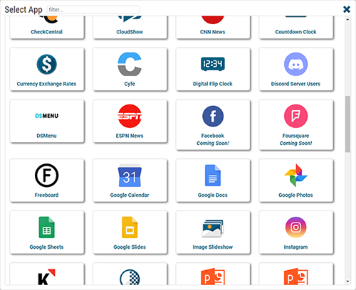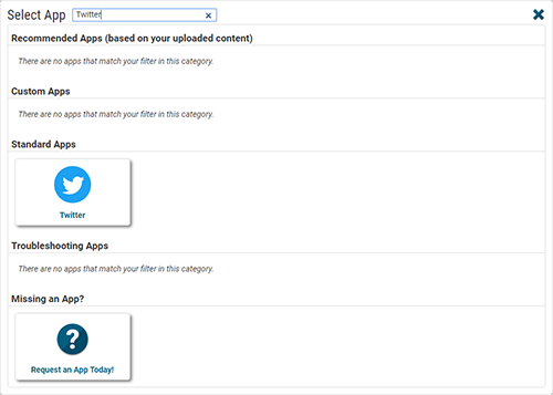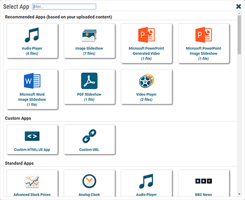 There is now a 'Recommended Apps' section at the top of the app selector window. This new section shows apps that support the files you have uploaded in your Content area. For example, if you upload some images and videos, the Image Slideshow and Video Player apps will be listed here for easy access.
